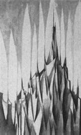 Now imagine these filaments forming the sides of a cube, each side of which consists of numerous clusters, one behind the other. There are many cubes laid out in a row so as to form a wall, or rather superwalls. These walls possess a sharpness which approaches that in the initial comparison I made with respect to Kilessopoulos's youthful cathedrals. To be more precise, I would say that these universal superstructures are not directly cathedrals but mainly nodules on a straight line, the likes of which can be seen on the pinnacles of cathedral spires.
