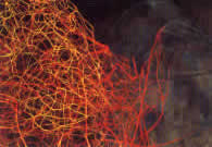 and time past He speaks of a condensed and dramatic form of time, as expressed in Eliot's poetry, poetry which he admits "deeply influenced his development his as a painter and as a thinker". In Kilessopoulos's performances, time is measurable, and fixed by the artist up until the last second. The flow of time is expressed in the movements of those who are seeking to interpret it, movements that are not random but predetermined by the artist himself, since they follow the music, which forms an integral part of the action. The artist is the orchestrator of the whole drama and has complete control over it, while there is an identification between real and artistic time for as long as the action lasts. In his latest works, such as the "Fractals", the artist becomes an interpreter of the drama, conceiving of and giving shape to time of an entirely different flow and quality. Time here is no longer the fixed time of the type that occurs in his performances, nor is it the real time in its static, solidified state, time that has elapsed, of the type that can be read in the rings of a fossilized tree, in the age of a rock. In the "Fractals" time is infinite, incorruptible, a form of time that exists independently of human activity, although humans exist within it and are defined by it. Gaps and solids vary in form from work to work and through the material and immaterial parts of the works varying versions of the same space and time are revealed. The presentation of themes in a space-time context that occurs in Kilesspoulos' works possesses its equivalent in literature. An example is "The Alexandrian Quartet" by Lawrence Durrell, a work in which the writer presents, through the mouths of different characters, on different levels and from different viewpoints, the same situations and events. The threads of the narratives, which present different aspects of the same tale, interweave and compose images, set in time and space, in the mind and soul of the reader. It ought to be made clear, though, that the space-time continuum here is of a different quality to that in the "Fractals", since it can actually be fixed and determined in terms of place and time. In the "Fractals", on the other hand, the space-time continuum transcends the limitations of 'time and place, despite the fact that it becomes a material phenomenon and acquires visible and tangible form. If we recall Paul Klee's saying that the essence of painting is to make the invisible visible, we can easily see that Apostolos Kilessopoulos' works bear out these words completely. Perhaps the painter's greatest contribution lies in the fact that by giving shape to images of the immaterial world he makes them visible, he becomes our guide in paths that we would never ourselves have followed and he opens the door to an exhilarating and uplifting world, raising above the level of the individual and the corruptible anyone who wishes to commune with his work. Angeliki Sahini [*] From T.S. Eliot's poem Burnt Norton. See T.S. Eliot, Ta Poiemata 1909-1962 (Exantas Pubs., Athens, 1994, translated by L.K. Vatakas with illustrations by A. Kilessopoulos), p. 303. |