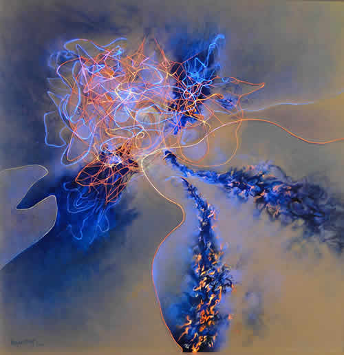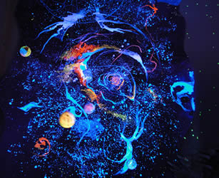 Α, λες. Αυτή η παραλία είναι πραγματική. Κοσμική νεραιδόσκονη μιμείται την άμμο και ο Αρχιμήδης σαν αστερίας ανασκαλεύει τα φύκια των ανησυχιών μας. Πατάμε ήδη την μπλε υπόφυση του Πήγασου κι αυτός μας δένει με σύννεφα με ανεπανάληπτη εκδικητική τρυφερότητα. Το κόκκινο ενός πάλσαρ κάτω από τα μαύρα αδράχτια αχινού αχνίζει ακόμη επιτηδευμένη αγωνία καρδιάς. Ρίγος μελλοθάνατου που ξέρει. Δαίμονες βγαίνουν από τα βαθύσκιωτα του ανυπεράσπιστου ορίζοντα ενώ ερωτιδείς σε οπλίζουν σάλπιγγες και τρίαινες. «Θες Ιησούς του Ναυή να γίνεις, ή μήπως Ποσειδώνας;» σε ρωτούν σκερτσόζικα όπως ο Μάγος Μέριλιν. Κι αν διαλέξεις δαίμονες εκεί είναι το φθονερό κίτρινο. Τότε όμως σε πιάνει το παραγάδι του βυζαντινού αυγού, κρόκος μέσα στο ασπράδι, χυλωμένο άσπρο, σαν κρυμμένη καταιγίδα στα γκέμια του Ηνίοχου. Φεύγει το άρμα του, τρέχει σε μια λεωφόρο σαν ροζ Ολντσμόμπιλ που σέρνει ξοπίσω της τενεκάκια του λούνα παρκ. Δένεσαι κι εσύ από πίσω ανυποψίαστε θεατή (ανυποψίαστος να είσαι αλλιώς θα ματώσεις στην εβένινη άσφαλτο που χάσκει από κάτω)… Ο αιθέρας λοιπόν λες, είναι αλήθεια. Μια ολοκληρωμένη φιλοσοφική αλήθεια που δεν περίμενες να έχει χρώμα και σχήμα. Χρώμα και σχήμα που βολεύονται στις καμπύλες του σώματος και του νου. Έρχονται και υπάρχουν στο σχήμα που γεννήθηκες. Δεν επιβάλλουν τίποτα γιατί τίποτα στον κόσμο του Κιλεσσόπουλου δεν επιβάλλεται. Μπορεί ο καθείς να συμπληρώσει τον αριθμό των απροσμέτρητων λέξεων για να περιγράψει τους πίνακες του. Άλλοι όμως ενδέχεται να κουραστούν. Υπάρχει όμως και γι αυτούς πρόβλεψη. Μπορούν να σβήσουν το Black Light και τότε το δωμάτιο θα φωτίσει σκοτάδι, ναι, ναι, σ’ αυτή την λεκτική αντίφαση, μουτρωμένη η μέσα μας σκοτεινιά θα απιθωθεί σε μια παραλλαγή απορίας, μπροστά στις πιθανότητες που είναι ανοιχτές, μπροστά στη δυνατότητα, άλλοτε να τις καβαλικεύουμε και να ξεχυνόμαστε με ξέπλεκα μαλλιά κι άλλοτε κουρασμένοι να ξεπεζεύουμε ξέπνοοι, αλλά ανθρώπινοι σε μια πρασινάδα ορφάνιας. Όταν σβήνεις το Black Light στους πίνακες του Κιλεσσόπουλου παγώνεις την σβελτάδα του Ουρανού ζητάς από τον καλλιτέχνη λίγο χρόνο σε ότι μπορεί ευκολότερα να καταλάβει το φυσιολογικό μάτι. Οι πίνακες μας κλείνουν το μάτι στην παράβαση. Όποτε θες μπαίνεις στην αλήθεια κι αν πάλι το επιθυμείς βγαίνεις. Οπότε γίνεσαι -κι εσύ ο θεατής- τη στιγμή που πατάς το διακόπτη καλλιτέχνης. Δεν είναι όμως μόνο παιχνίδι αλλά και μάθημα Δημοκρατίας. Είναι αδύνατο να έχεις από όλους τις ίδιες απαιτήσεις. Για την ακρίβεια αν έχεις τόσες απαιτήσεις θα πρέπει να διαθέτεις την ανάλογη κατανόηση. Πρέπει να μπεις δεύτερος στη σειρά. Να μην διεκδικείς αλλά να σου παραχωρούν. Η χρήση του διακόπτη στο Black Light ίσως είναι τελικά δυσκολότερη, γιατί η Απόφαση κρύβεται στον πίνακα. Απόστολος Λυκεσάς
